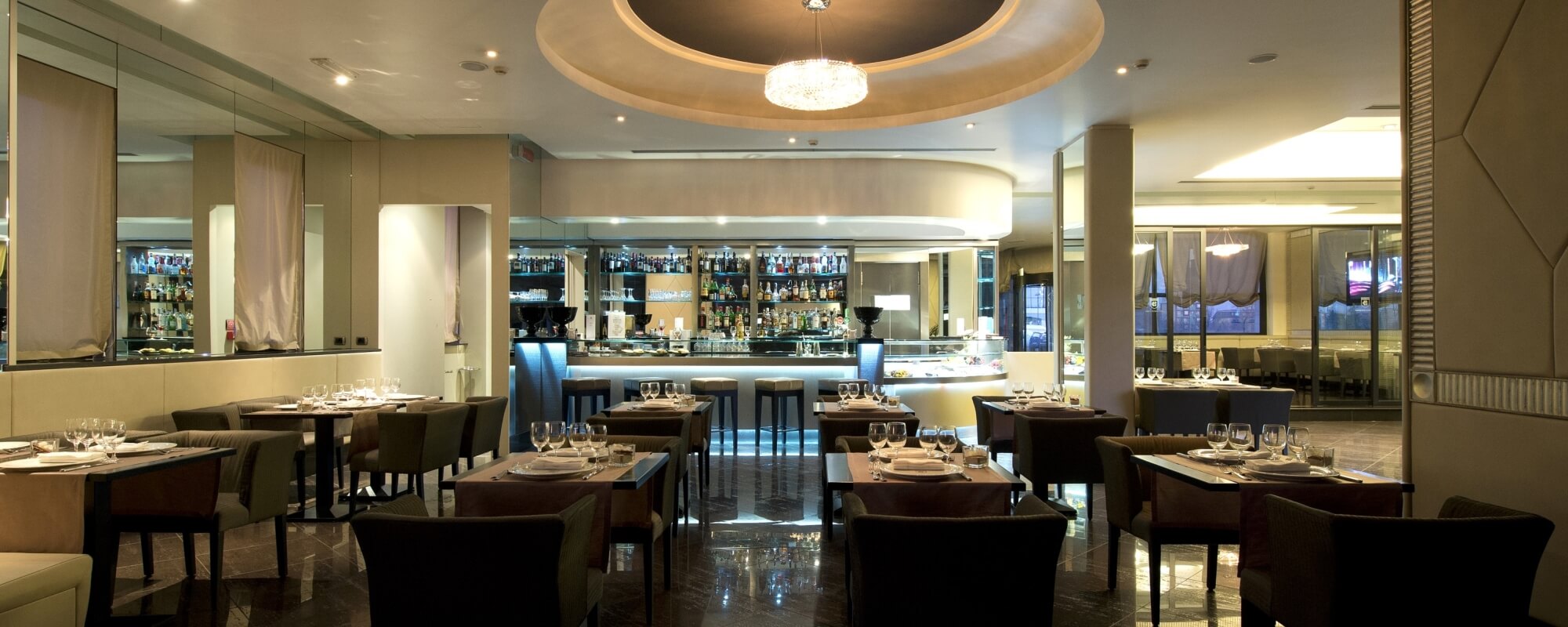 Una spettacolare parete in vetro separa il Ristorante dal Bar, spazio nato dall’idea di creare un ambiente minimal-chic che sappia restituire un’atmosfera emozionante, avvolgente e coinvolgente.